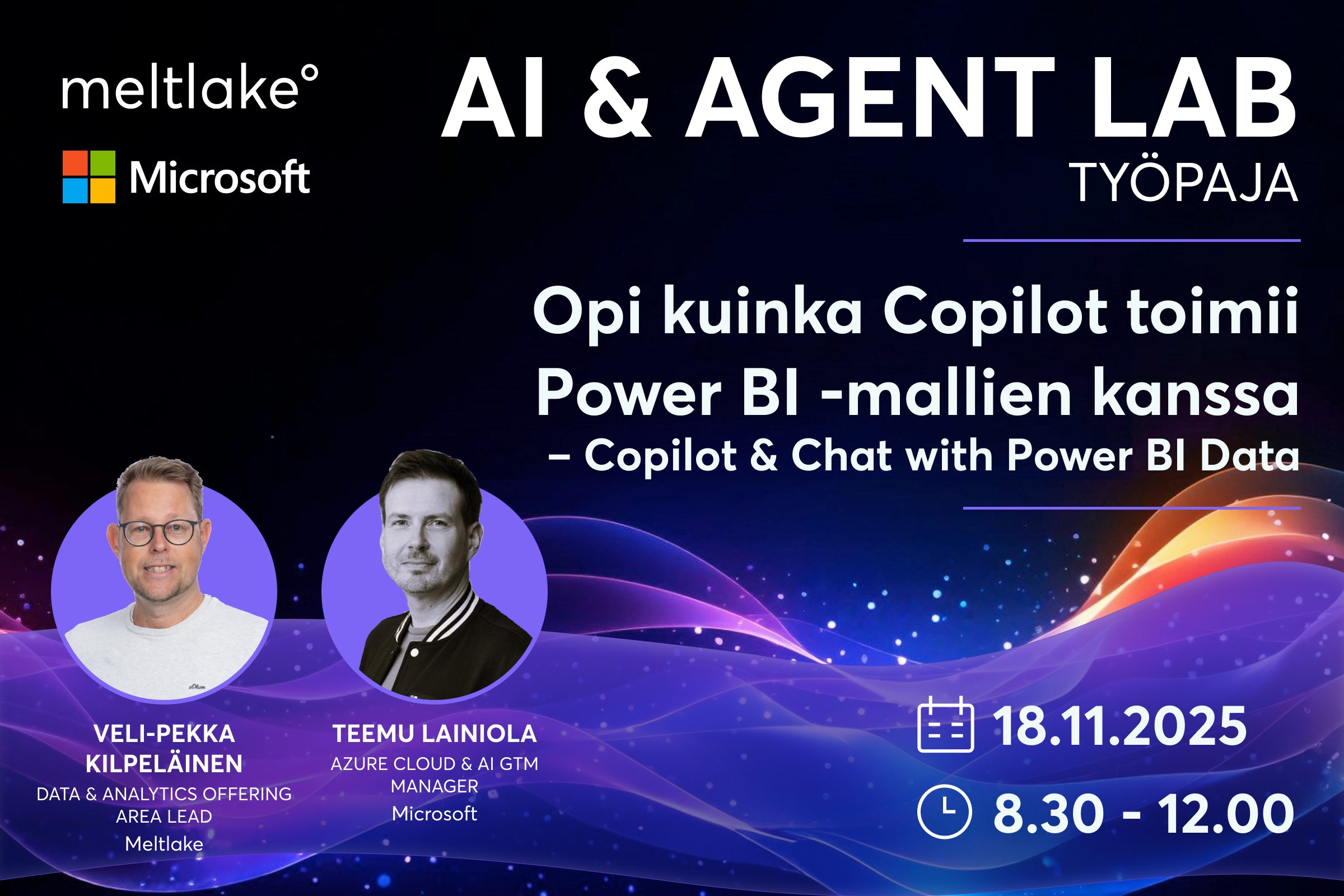 TAPAHTUMA PÄÄTTYNYT Tervetuloa työpajaan, jossa opit keskustelemaan suoraan organisaatiosi datasta Microsoft Copilotin avulla Power BI:n semanttisia malleja hyödyntäen. Näet käytännön demot ja opit, miten tekoäly nopeuttaa tiedon saatavuutta, lisää päätöksenteon läpinäkyvyyttä ja vahvistaa datalla johtamista kaikilla organisaatiotasoilla.